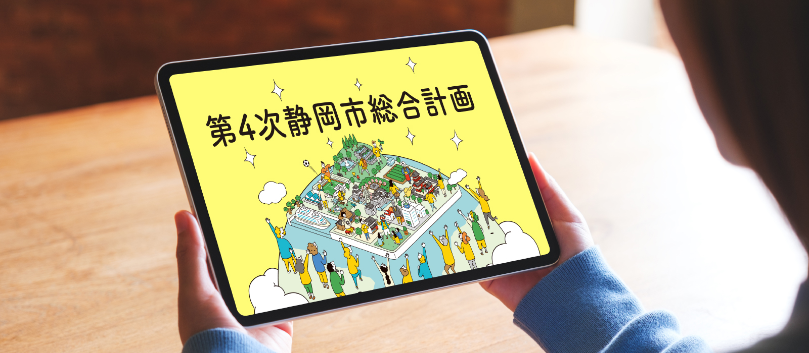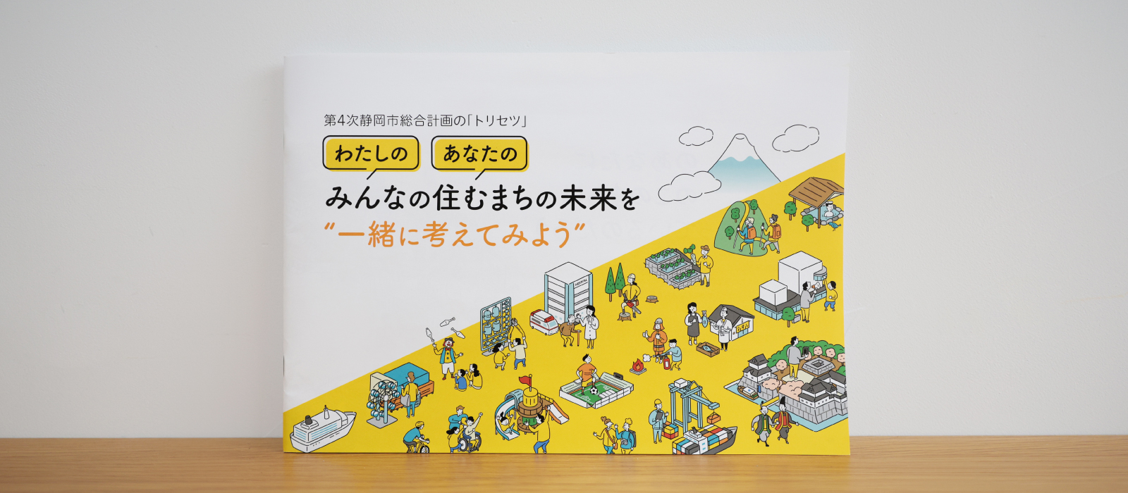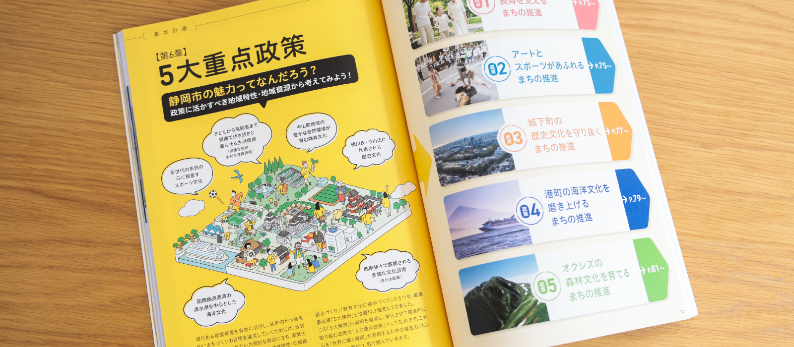 総合計画は行政運営における最上位の計画として、静岡市では8年ごとに更新されている計画です。縁あって前回の第3次静岡市総合計画より制作に携わらせていただいており、今回も気を引き締めて担当させていただきました。市民参画を軸に策定された計画であることから、子どもから大人まで幅広い方々に手に取ってもらえるインパクトと、将来目標や施策を理解しやすい構成を意識してご提案させていただきました。